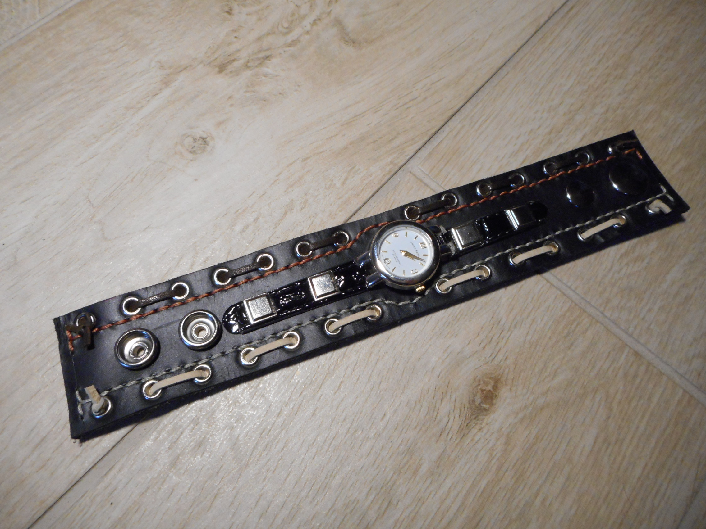 Bőr karkötő órával, bőr díszcsíkokkal, fém ringlikkel, patentos rögzítéssel. Az óra csavarozott.